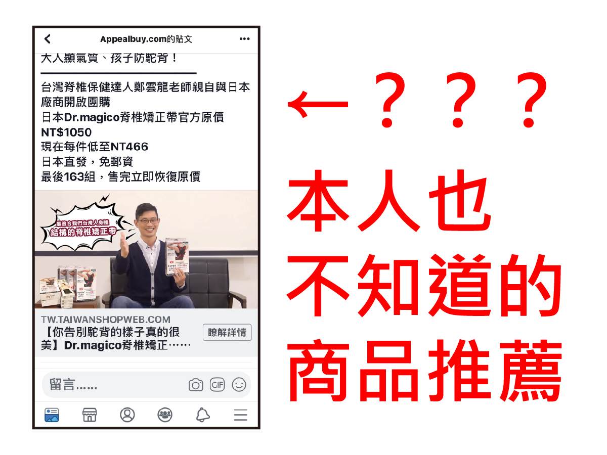 3/15早上(今天),有我們的學員和我們分享,他收到了「台灣脊椎保健達人鄭雲龍老師親自與日本廠商開啟團購」的「Dr.Magico脊椎矯正帶」的廣告訊息