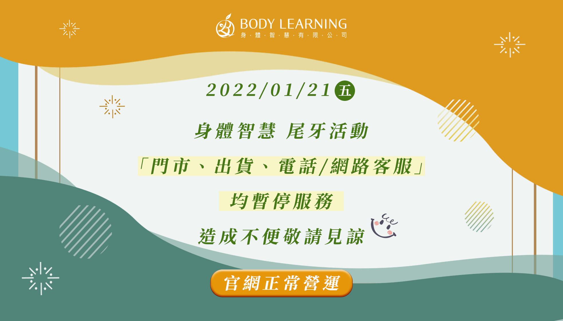 2022.01. 20▍尾牙休假公告 ▍2022/01/21(五) 身體智慧尾牙活動「門市、出貨、電話/網路客服(Line、FB、Email)」均暫停服務。‧ 官網正常營運(可購買商品&報名課程)如有任何問題歡迎來信告知,我們將在2022/01/22(六)上班日(補班),依序協助處理!身體智慧全體員工 敬上