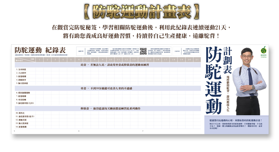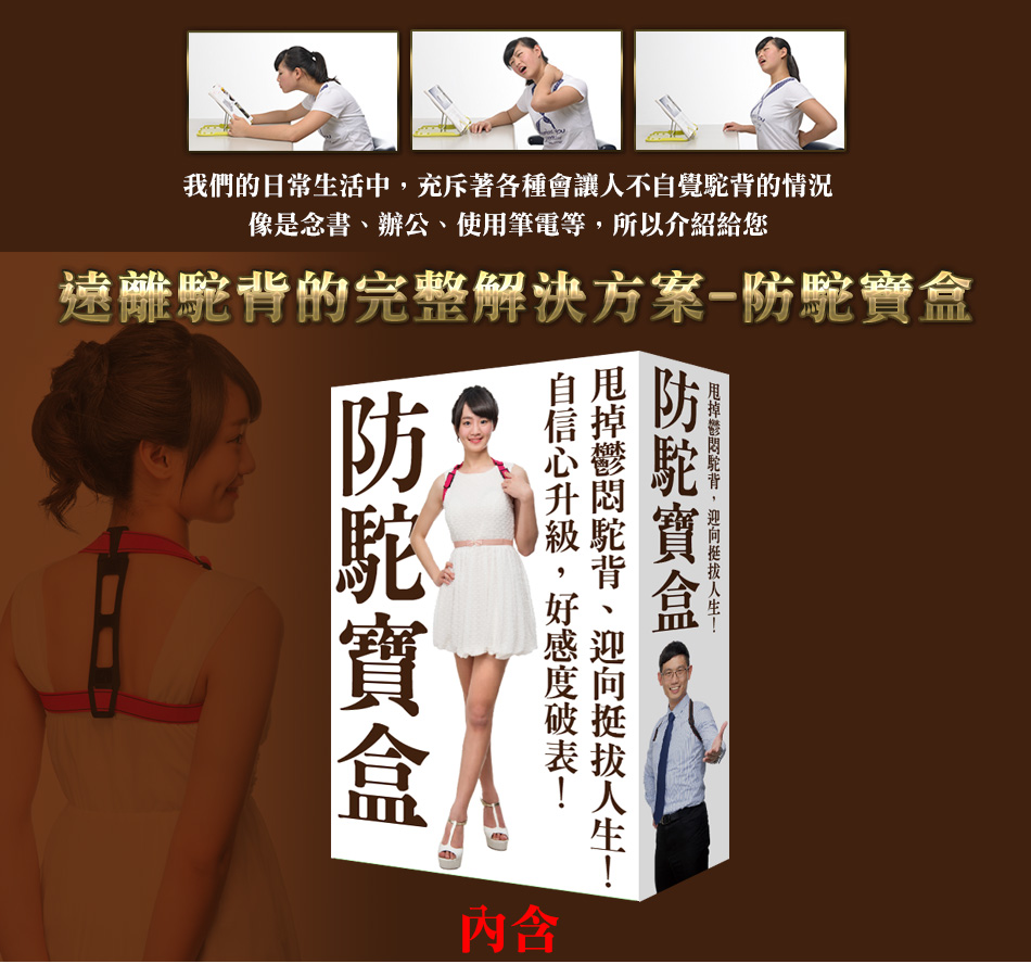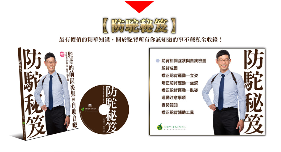 內容物︰防駝祕笈DVDx1、防駝妙手x1、端正帶x1、防駝運動計畫表x1